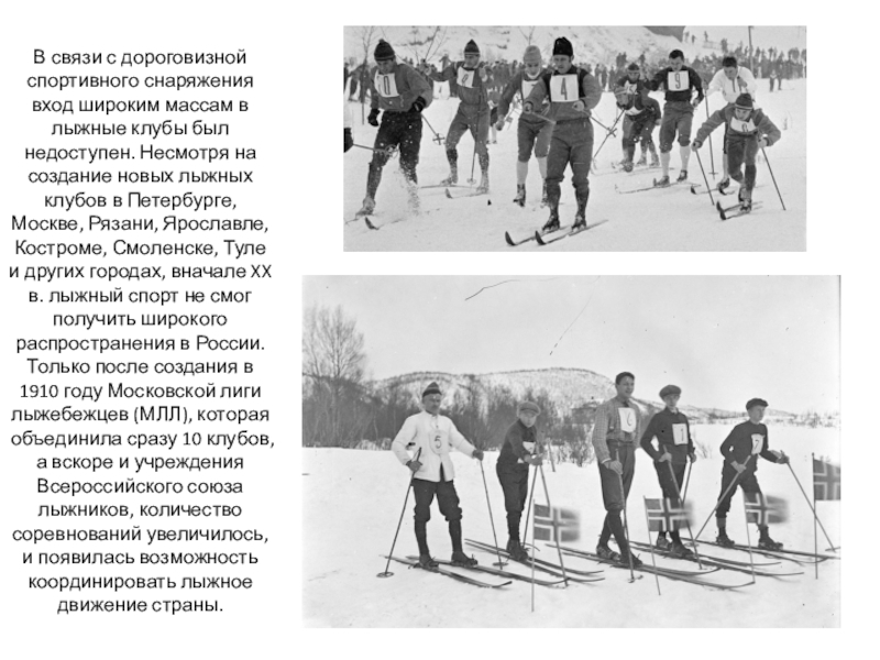 клубы был недоступен. Несмотря на создание новых лыжных клубов в Петербурге, Москве, Рязани, Ярославле, Костроме, Смоленске, Туле и других городах, вначале XX в. лыжный спорт не смог получить широкого распространения в России. Только после создания в 1910 году Московской лиги лыжебежцев (МЛЛ), которая объединила сразу 10 клубов, а вскоре и учреждения Всероссийского союза лыжников, количество соревнований увеличилось, и появилась возможность координировать лыжное движение страны.