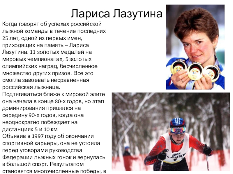 25 лет, одной из первых имен, приходящих на память – Лариса Лазутина. 11 золотых медалей на мировых чемпионатах, 5 золотых олимпийских наград, бесчисленное множество других призов. Все это смогла завоевать несравненная российская лыжница.