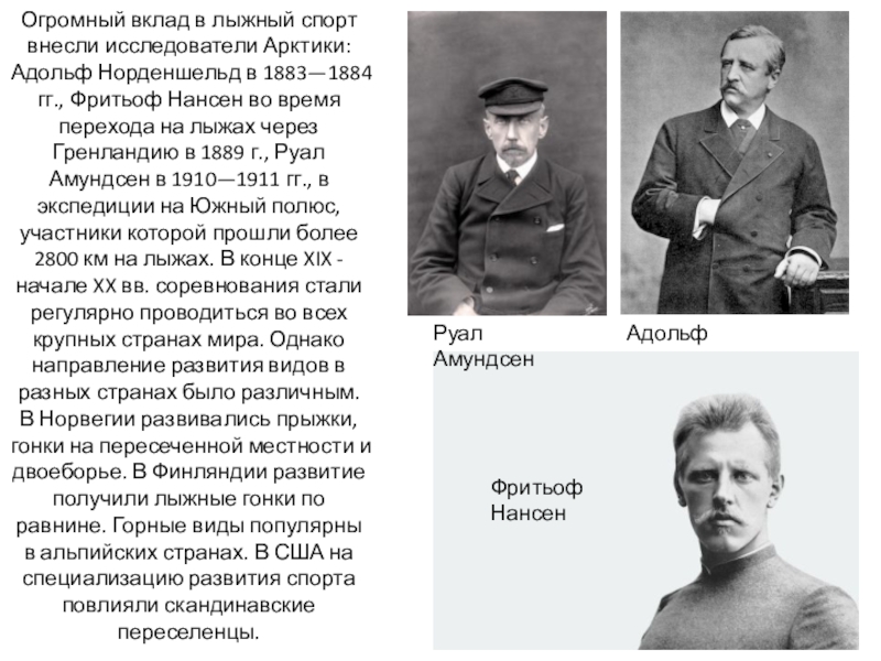 Слайд 5Огромный вклад в лыжный спорт внесли исследователи Арктики: Адольф Норденшельд в