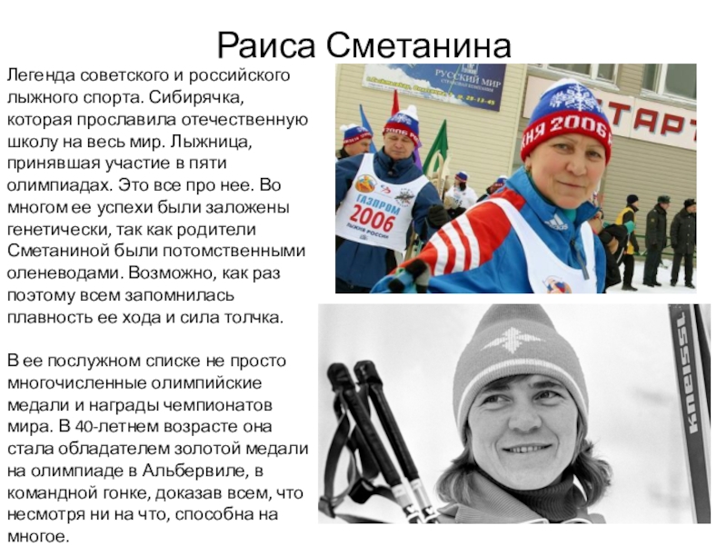 школу на весь мир. Лыжница, принявшая участие в пяти олимпиадах. Это все про нее. Во многом ее успехи были заложены генетически, так как родители Сметаниной были потомственными оленеводами. Возможно, как раз поэтому всем запомнилась плавность ее хода и сила толчка.