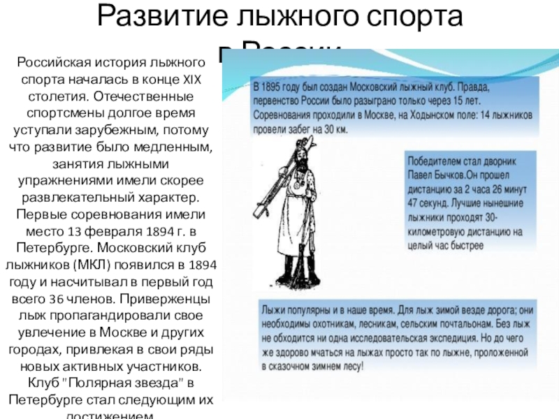 столетия. Отечественные спортсмены долгое время уступали зарубежным, потому что развитие было медленным, занятия лыжными упражнениями имели скорее развлекательный характер. Первые соревнования имели место 13 февраля 1894 г. в Петербурге. Московский клуб лыжников (МКЛ) появился в 1894 году и насчитывал в первый год всего 36 членов. Приверженцы лыж пропагандировали свое увлечение в Москве и других городах, привлекая в свои ряды новых активных участников. Клуб "Полярная звезда" в Петербурге стал следующим их достижением.