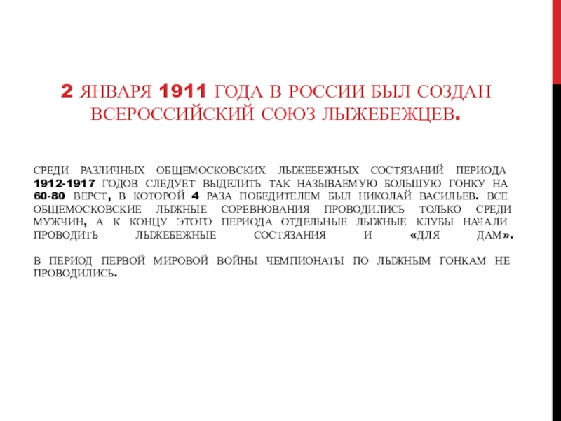 2 января 1911 года в России был создан Всероссийский союз лыжебежцев.