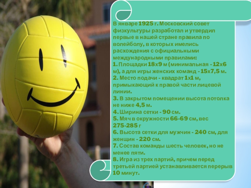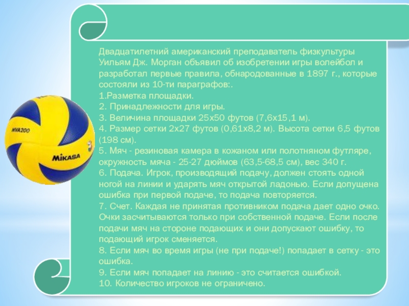 волейбол и разработал первые правила, обнародованные в 1897 г., которые состояли из 10-ти параграфов:. 1.Разметка площадки.
