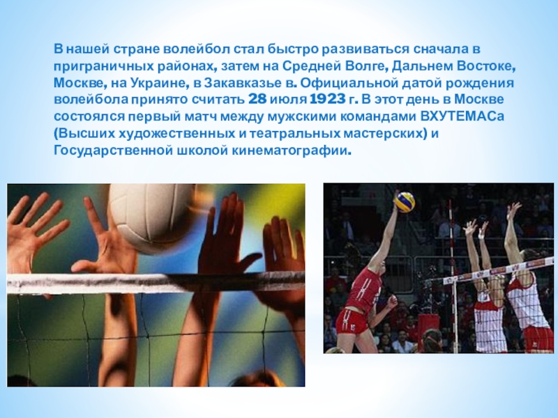 затем на Средней Волге, Дальнем Востоке, Москве, на Украине, в Закавказье в. Официальной датой рождения волейбола принято считать 28 июля 1923 г. В этот день в Москве состоялся первый матч между мужскими командами ВХУТЕМАСа (Высших художественных и театральных мастерских) и Государственной школой кинематографии.
