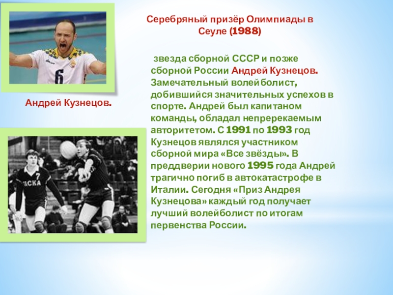 Слайд 14 звезда сборной СССР и позже сборной России Андрей Кузнецов. Замечательный волейболист,