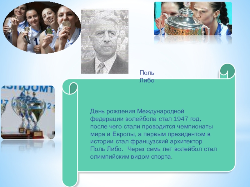 проводится чемпионаты мира и Европы, а первым президентом в истории стал французский архитектор Поль Либо. Через семь лет волейбол стал олимпийским видом спорта.