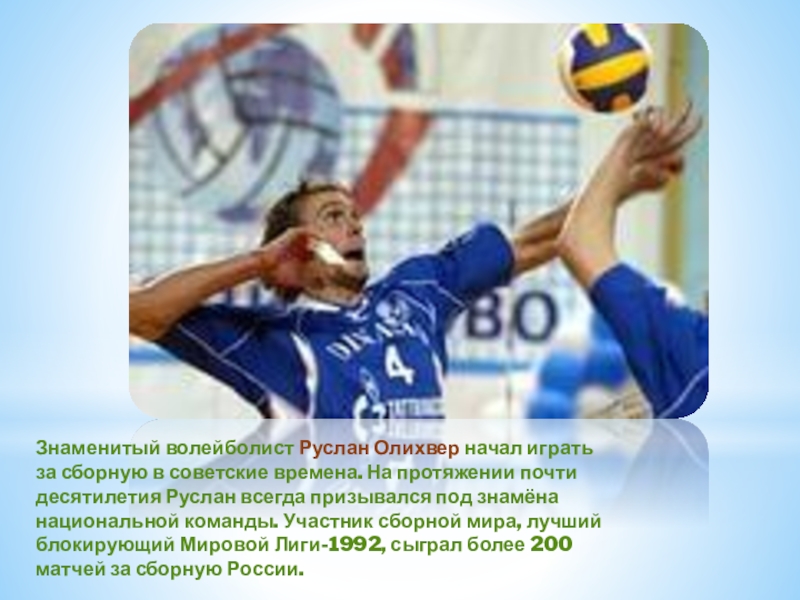 Слайд 18Знаменитый волейболист Руслан Олихвер начал играть за сборную в советские времена. На протяжении