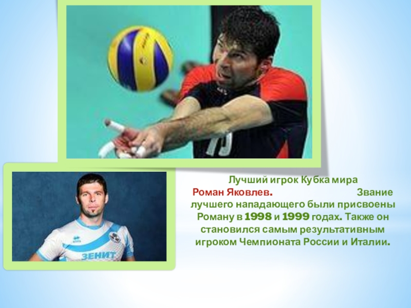 Роман Яковлев. Звание лучшего нападающего были присвоены Роману в 1998 и 1999 годах. Также он становился самым результативным игроком Чемпионата России и Италии.