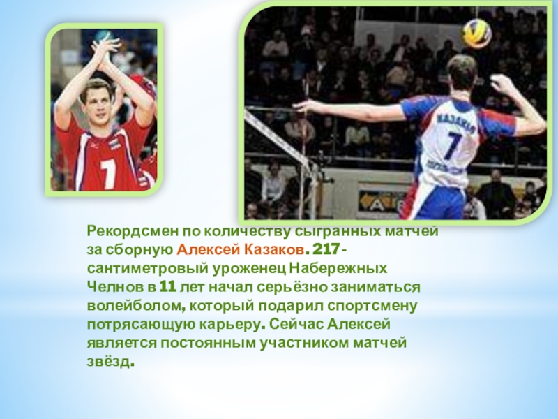 Слайд 17Рекордсмен по количеству сыгранных матчей за сборную Алексей Казаков. 217-сантиметровый уроженец Набережных