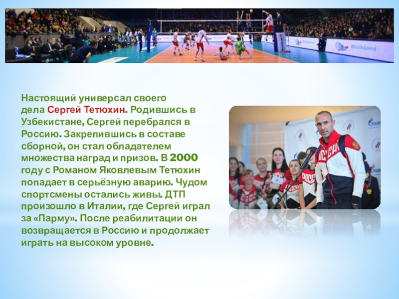 Россию. Закрепившись в составе сборной, он стал обладателем множества наград и призов. В 2000 году с Романом Яковлевым Тетюхин попадает в серьёзную аварию. Чудом спортсмены остались живы. ДТП произошло в Италии, где Сергей играл за «Парму». После реабилитации он возвращается в Россию и продолжает играть на высоком уровне.