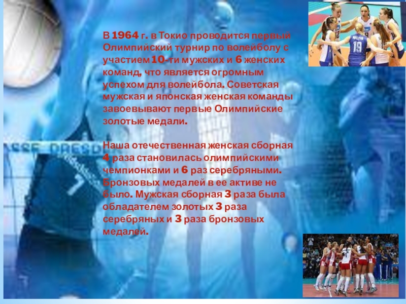Слайд 13В 1964 г. в Токио проводится первый Олимпийский турнир по волейболу