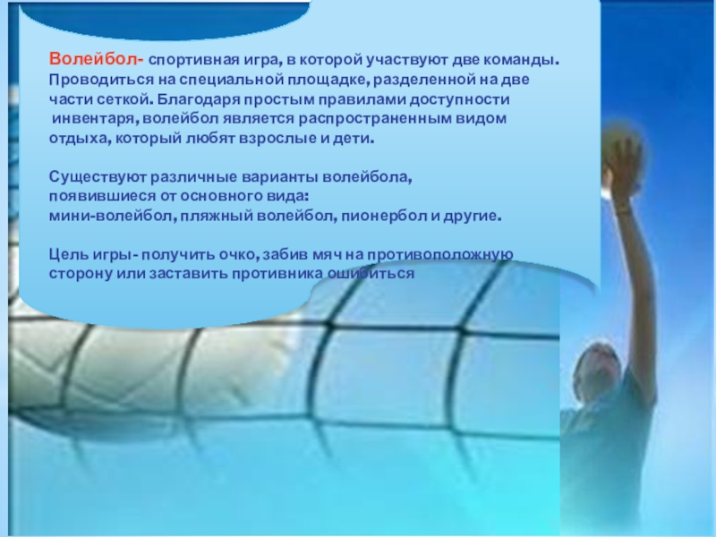 Слайд 2Волейбол- спортивная игра, в которой участвуют две команды.
