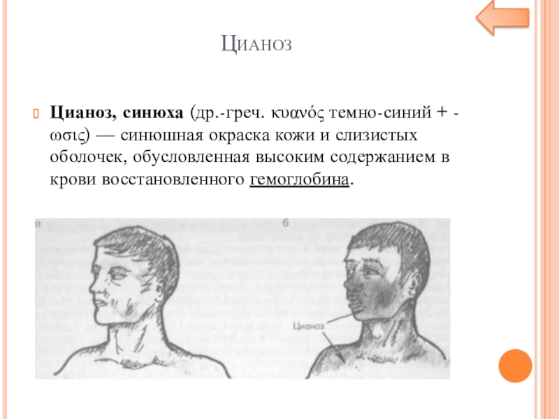 Цианоз, синюха (др.-греч. κυανός темно-синий + -ωσις) — синюшная окраска кожи и слизистых оболочек, обусловленная высоким