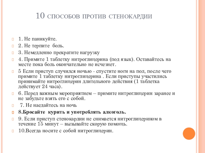 9. Если приступ стенокардии не снимается нитроглицерином в течение 15 минут – вызывайте скорую помощь.