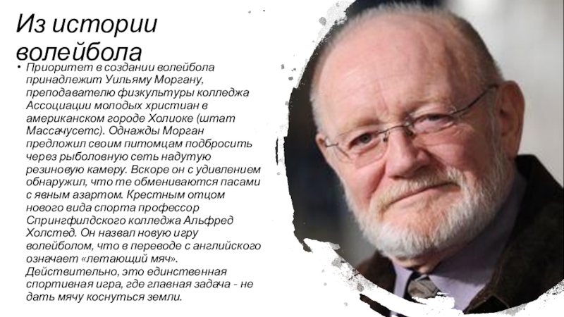 Из истории волейболаПриоритет в создании волейбола принадлежит Уильяму Моргану, преподавателю физкультуры колледжа Ассоциации молодых христиан в американском