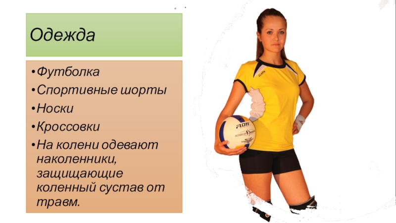ОдеждаФутболка Спортивные шорты Носки Кроссовки На колени одевают наколенники, защищающие коленный сустав от травм.