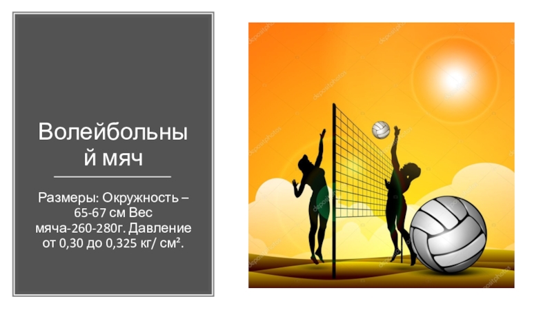 Волейбольный мяч Размеры: Окружность – 65-67 см Вес мяча-260-280г. Давление от 0,30 до 0,325 кг/ см².