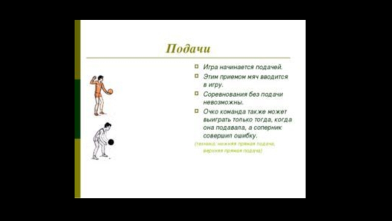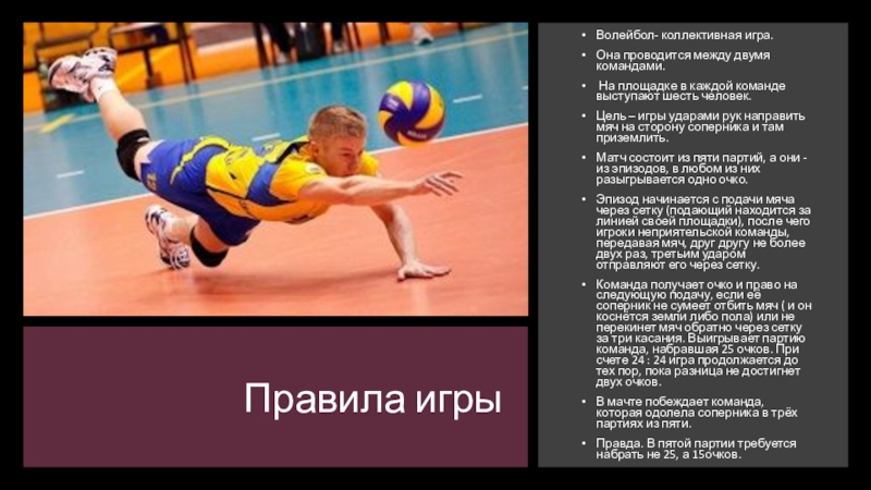 Правила игрыВолейбол- коллективная игра. Она проводится между двумя командами. На площадке в каждой команде выступают шесть человек. Цель – игры