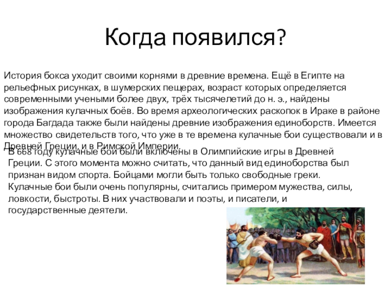 В 668 году кулачные бои были включены в Олимпийские игры в Древней Греции. С этого момента можно считать, что данный вид единоборства был признан видом спорта. Бойцами могли быть только свободные греки. Кулачные бои были очень популярны, считались примером мужества, силы, ловкости, быстроты. В них участвовали и поэты, и писатели, и государственные деятели.