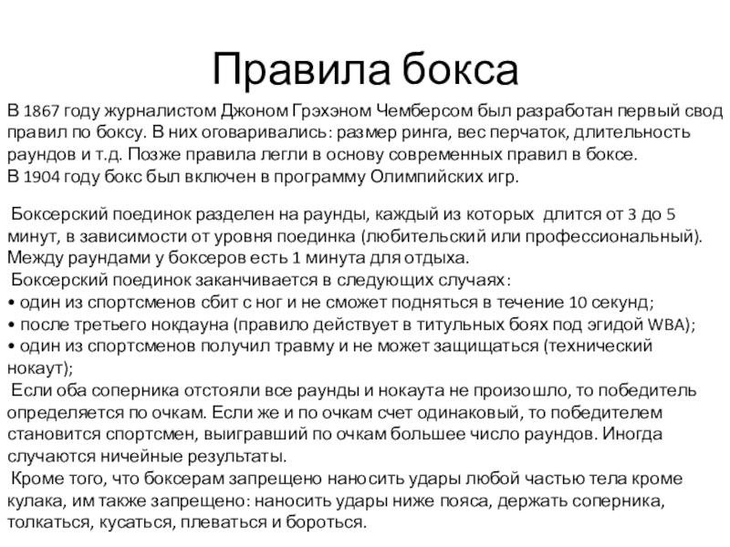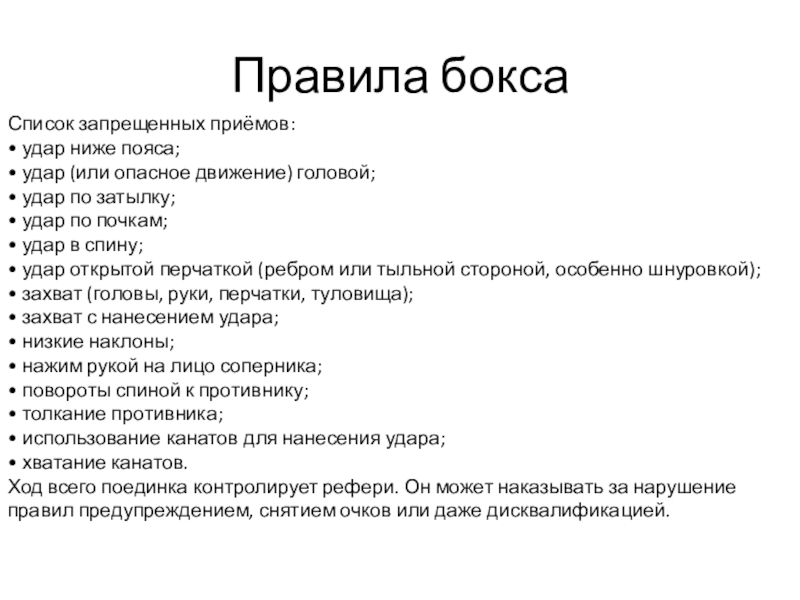 Кроме того, что боксерам запрещено наносить удары любой частью тела кроме кулака, им также запрещено: наносить удары ниже пояса, держать соперника, толкаться, кусаться, плеваться и бороться.