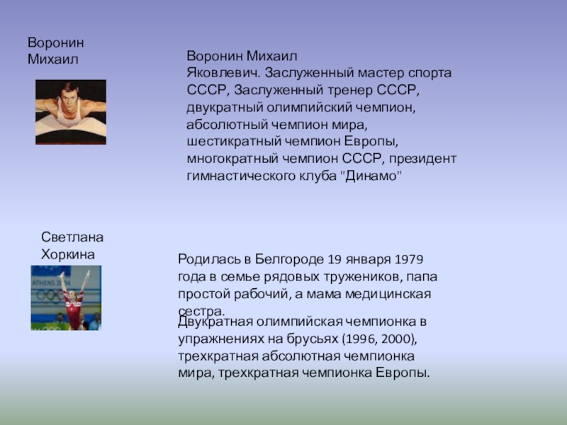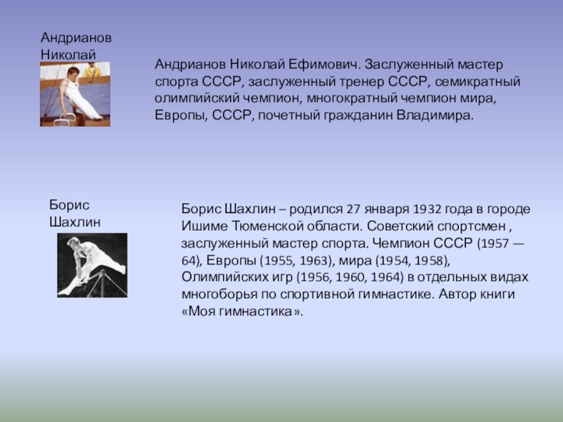 Борис Шахлин – родился 27 января 1932 года в городе Ишиме Тюменской области. Советский спортсмен , заслуженный мастер спорта. Чемпион СССР (1957 — 64), Европы (1955, 1963), мира (1954, 1958), Олимпийских игр (1956, 1960, 1964) в отдельных видах многоборья по спортивной гимнастике. Автор книги «Моя гимнастика».