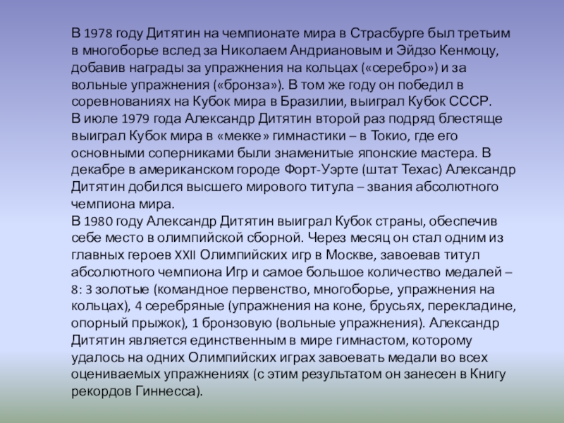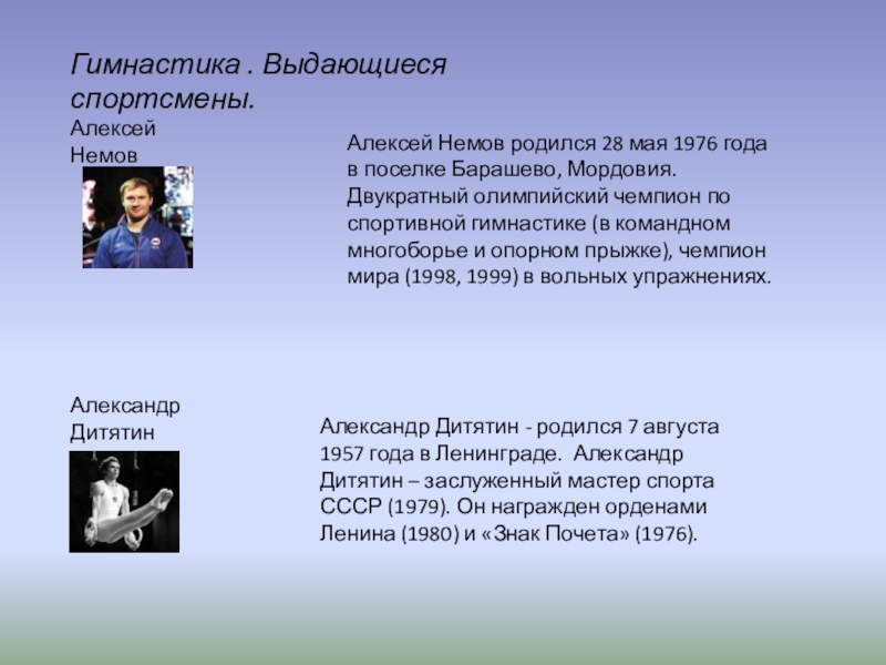 Александр Дитятин - родился 7 августа 1957 года в Ленинграде. Александр Дитятин – заслуженный мастер спорта СССР (1979). Он награжден орденами Ленина (1980) и «Знак Почета» (1976).