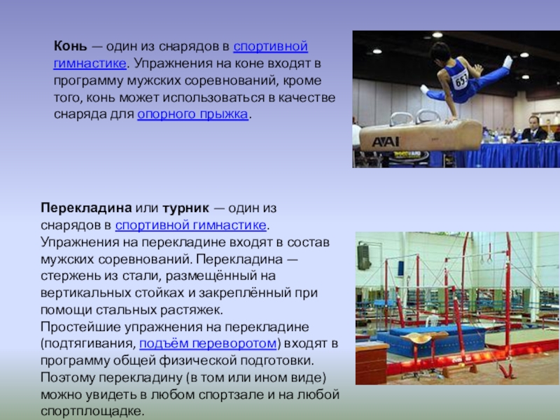 Простейшие упражнения на перекладине (подтягивания, подъём переворотом) входят в программу общей физической подготовки. Поэтому перекладину (в том или ином виде) можно увидеть в любом спортзале и на любой спортплощадке.