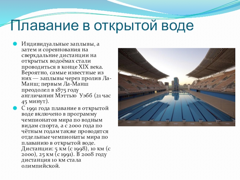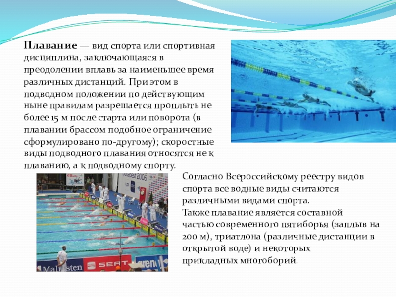 Также плавание является составной частью современного пятиборья (заплыв на 200 м), триатлона (различные дистанции в открытой воде) и некоторых прикладных многоборий.