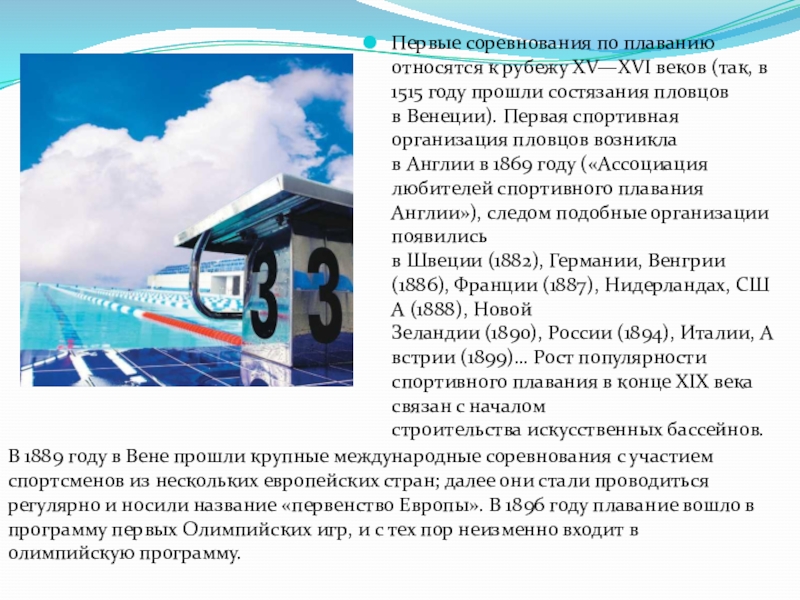 Первые соревнования по плаванию относятся к рубежу XV—XVI веков (так, в 1515 году прошли состязания пловцов в Венеции)[2].