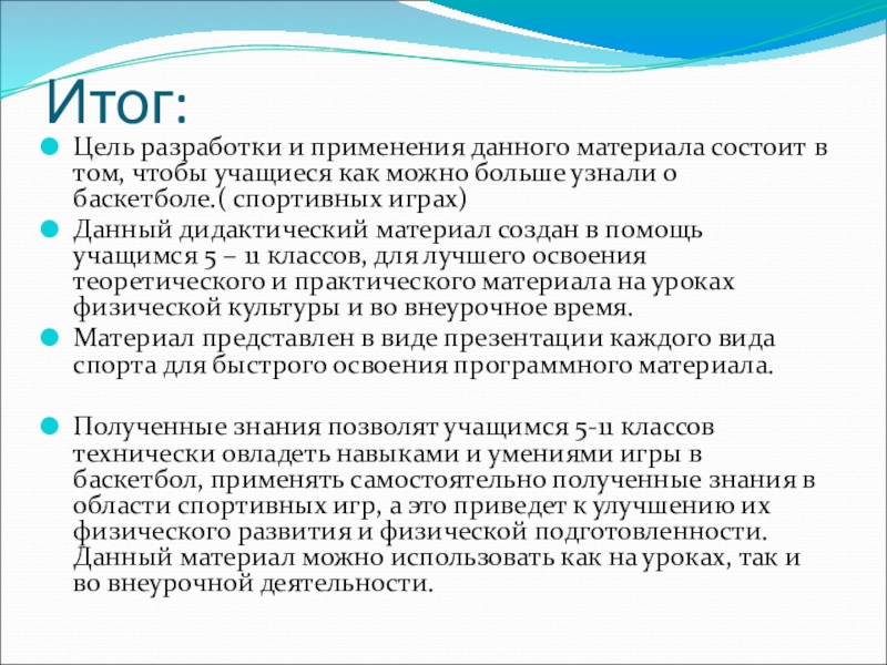 Полученные знания позволят учащимся 5-11 классов технически овладеть навыками и умениями игры в баскетбол, применять самостоятельно полученные знания в области спортивных игр, а это приведет к улучшению их физического развития и физической подготовленности.