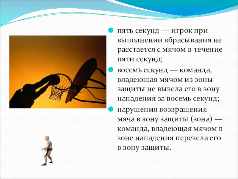 Слайд 9пять секунд — игрок при выполнении вбрасывания не расстается с мячом в
