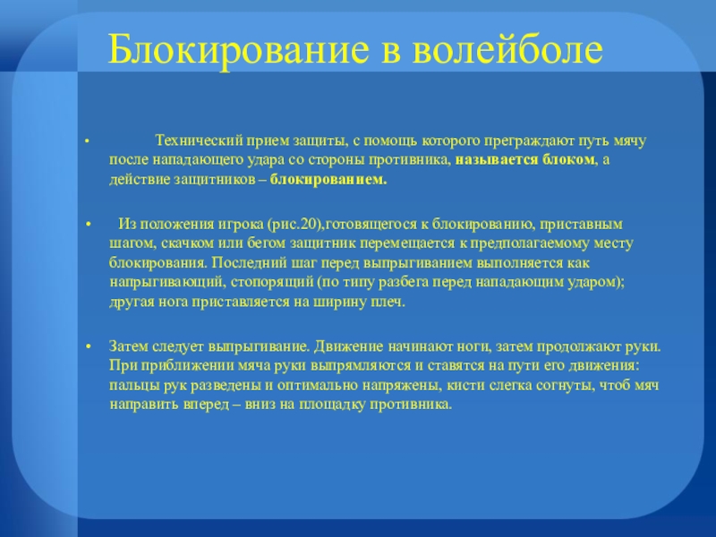 защиты, с помощь которого преграждают путь мячу после нападающего удара со стороны противника, называется блоком, а действие защитников – блокированием.