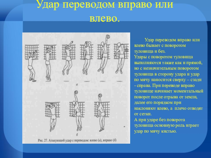 Изменяя движения руки и кисти, можно выполнять также нападающие удары с переводом мяча вправо и влево.