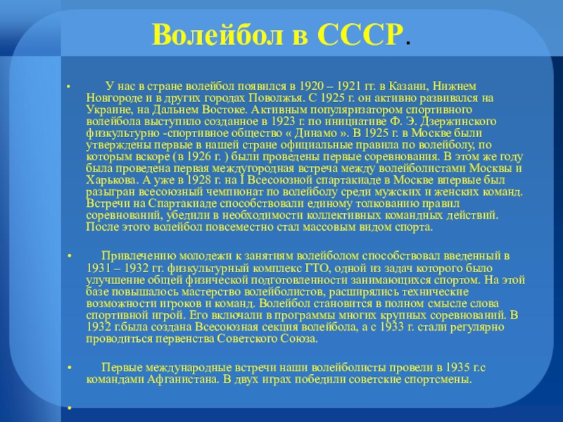 появился в 1920 – 1921 гг. в Казани, Нижнем Новгороде и в других городах Поволжья. С 1925 г. он активно развивался на Украине, на Дальнем Востоке. Активным популяризатором спортивного волейбола выступило созданное в 1923 г. по инициативе Ф. Э. Дзержинского физкультурно -спортивное общество « Динамо ». В 1925 г. в Москве были утверждены первые в нашей стране официальные правила по волейболу, по которым вскоре (в 1926 г. ) были проведены первые соревнования. В этом же году была проведена первая междугородная встреча между волейболистами Москвы и Харькова. А уже в 1928 г. на I Всесоюзной спартакиаде в Москве впервые был разыгран всесоюзный чемпионат по волейболу среди мужских и женских команд. Встречи на Спартакиаде способствовали единому толкованию правил соревнований, убедили в необходимости коллективных командных действий. После этого волейбол повсеместно стал массовым видом спорта.