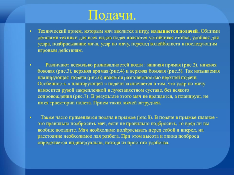 Различают несколько разновидностей подач : нижняя прямая (рис.2), нижняя боковая (рис.3), верхняя прямая (рис.4) и верхняя боковая (рис.5). Так называемая планирующая подача (рис.6) является разновидностью верхней подачи. Особенность « планирующей » подачи заключается в том, что удар по мячу наносится рукой закрепленной в лучезапястном суставе, без всякого сопровождения (рис.7). В результате этого мяч не вращается, а планирует, не имея траектории полета. Прием таких мячей затруднен.