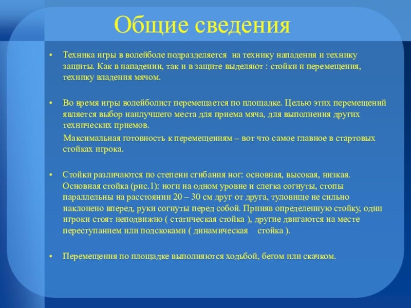 Стойки различаются по степени сгибания ног: основная, высокая, низкая. Основная стойка (рис.1): ноги на одном уровне и слегка согнуты, стопы параллельны на расстоянии 20 – 30 см друг от друга, туловище не сильно наклонено вперед, руки согнуты перед собой. Приняв определенную стойку, одни игроки стоят неподвижно ( статическая стойка ), другие двигаются на месте переступанием или подскоками ( динамическая стойка ).