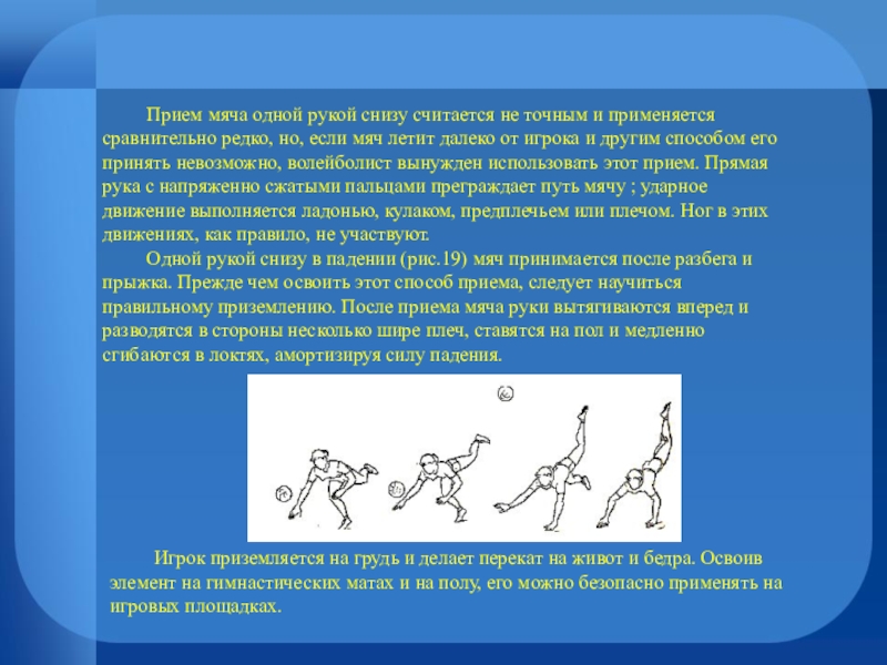 Одной рукой снизу в падении (рис.19) мяч принимается после разбега и прыжка. Прежде чем освоить этот способ приема, следует научиться правильному приземлению. После приема мяча руки вытягиваются вперед и разводятся в стороны несколько шире плеч, ставятся на пол и медленно сгибаются в локтях, амортизируя силу падения.