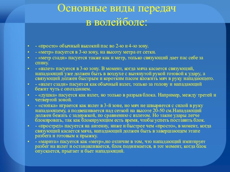 По направлению относительно передающего различают передачи вперед, над собой и назад. По длине траектории различают : длинные передачи – через зону ; короткие - в соседнюю зону ; укороченные – в свою зону. По высоте различают передачи низкие (до 1 м над сеткой), средние (свыше 2 м), а по расстоянию от сетки – близкие (менее 0,5 м) и отдаленные ( более 0,5 м ).