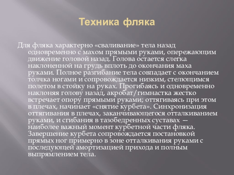 руками, опережающим движение головой назад. Голова остается слегка наклоненной на грудь вплоть до окончания маха руками. Полное разгибание тела совпадает с окончанием толчка ногами и сопровождается низким, стелющимся полетом в стойку на руках. Прогибаясь и одновременно наклоняя голову назад, акробат/гимнастка жестко встречает опору прямыми руками; оттягиваясь при этом в плечах, начинает «снятие курбета». Синхронизация оттягивания в плечах, заканчивающегося отталкиванием руками, и сгибания в тазобедренных суставах — наиболее важный момент курбетной части фляка. Завершение курбета сопровождается постановкой прямых ног примерно в зоне отталкивания руками с последующей амортизацией прихода и полным выпрямлением тела.