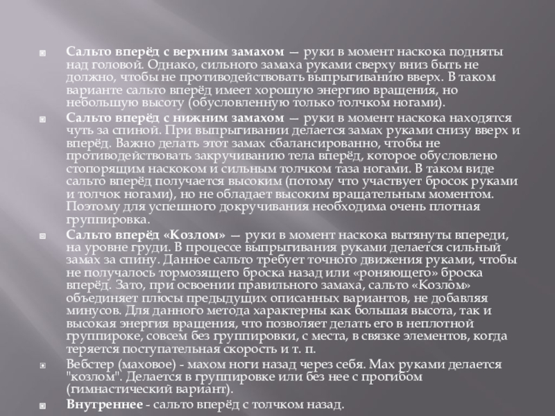 Однако, сильного замаха руками сверху вниз быть не должно, чтобы не противодействовать выпрыгиванию вверх. В таком варианте сальто вперёд имеет хорошую энергию вращения, но небольшую высоту (обусловленную только толчком ногами).