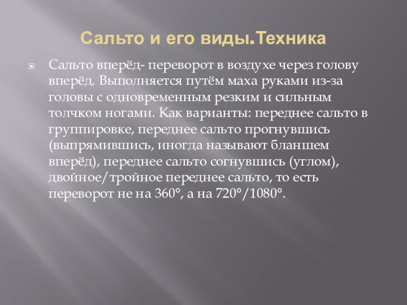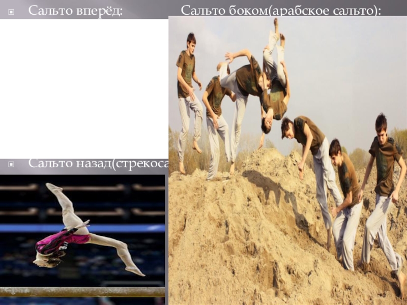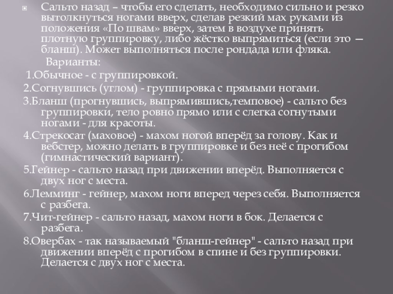 Слайд 10Сальто назад – чтобы его сделать, необходимо сильно и резко вытолкнуться