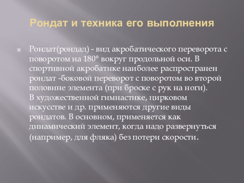 вокруг продольной оси. В спортивной акробатике наиболее распространен рондат -боковой переворот с поворотом во второй половине элемента (при броске с рук на ноги). В художественной гимнастике, цирковом искусстве и др. применяются другие виды рондатов. В основном, применяется как динамический элемент, когда надо развернуться (например, для фляка) без потери скорости.