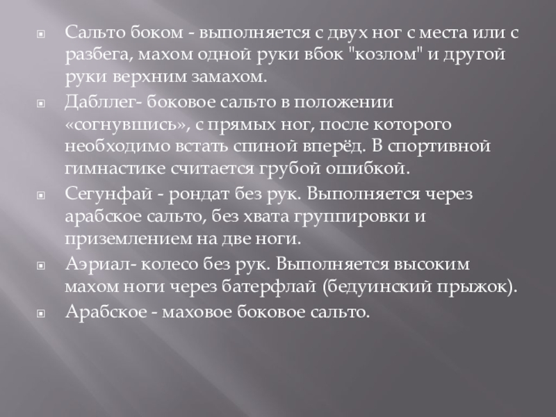 Слайд 11Сальто боком - выполняется с двух ног с места или с