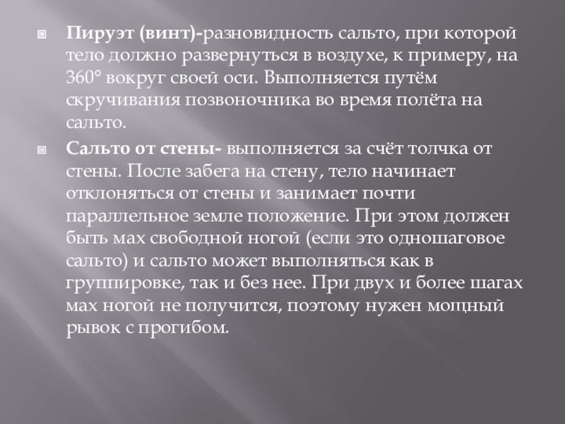 Слайд 12Пируэт (винт)-разновидность сальто, при которой тело должно развернуться в воздухе, к