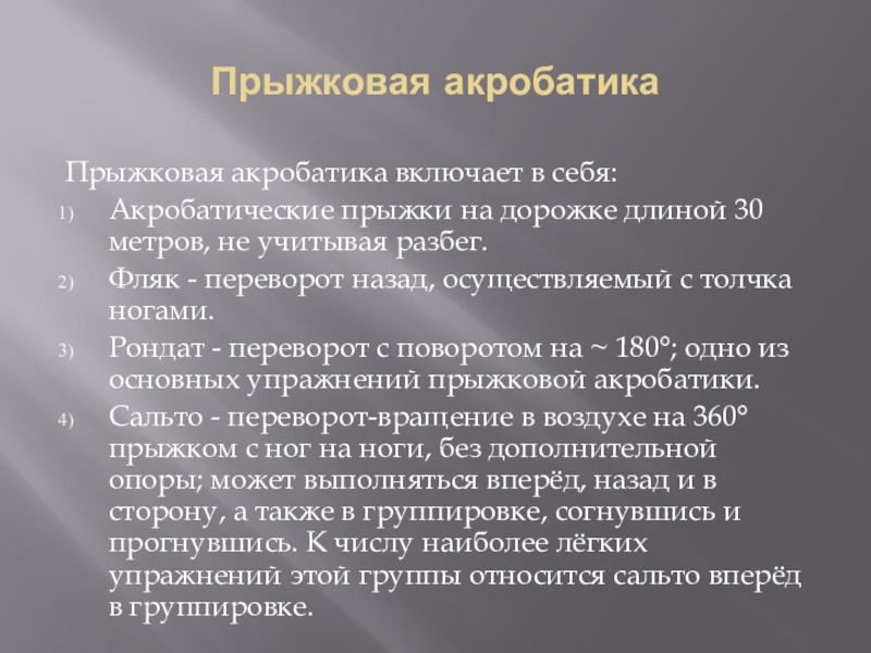 8.Овербах - так называемый "бланш-гейнер" - сальто назад при движении вперёд с прогибом в спине и без группировки. Делается с двух ног с места.