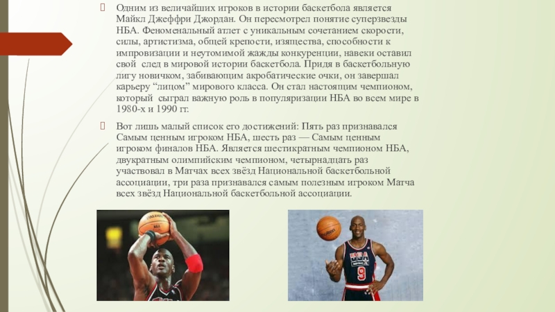 Слайд 13Одним из величайших игроков в истории баскетбола является Майкл Джеффри Джордан.