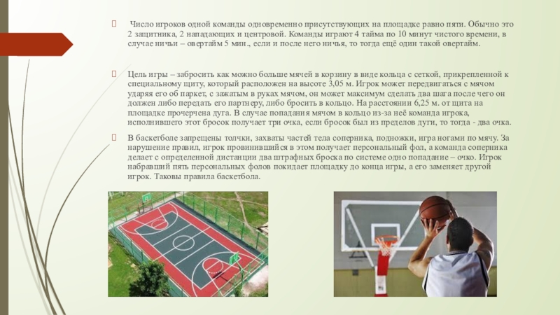 В баскетболе запрещены толчки, захваты частей тела соперника, подножки, игра ногами по мячу. За нарушение правил, игрок провинившийся в этом получает персональный фол, а команда соперника делает с определенной дистанции два штрафных броска по системе одно попадание – очко. Игрок набравший пять персональных фолов покидает площадку до конца игры, а его заменяет другой игрок. Таковы правила баскетбола.
