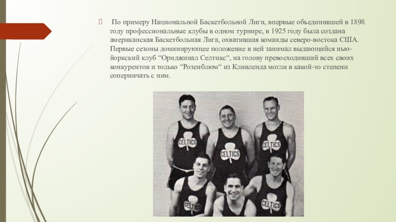 профессиональные клубы в одном турнире, в 1925 году была создана американская Баскетбольная Лига, охватившая команды северо-востока США. Первые сезоны доминирующее положение в ней занимал выдающийся нью-йоркский клуб “Оpиджинал Селтикс“, на голову превосходивший всех своих конкурентов и только “Розенблюм“ из Кливленда могли в какой-то степени соперничать с ним.