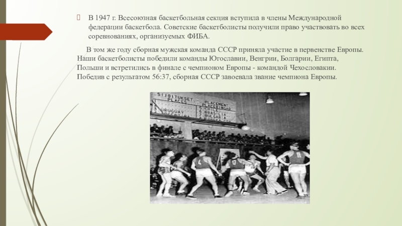 Слайд 11В 1947 г. Всесоюзная баскетбольная секция вступила в члены Международной федерации