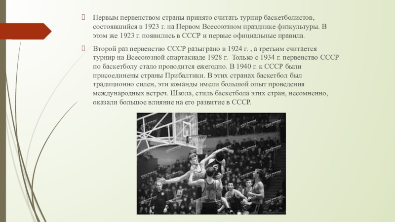 Второй раз первенство СССР разыграно в 1924 г. , а третьим считается турнир на Всесоюзной спартакиаде 1928 г. Только с 1934 г. первенство СССР по баскетболу стало проводится ежегодно. В 1940 г. к СССР были присоединены страны Прибалтики. В этих странах баскетбол был традиционно силен, эти команды имели большой опыт проведения международных встреч. Школа, стиль баскетбола этих стран, несомненно, оказали большое влияние на его развитие в СССР.